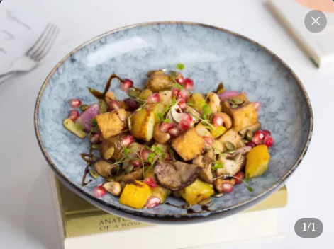 烤土豆、烤节瓜、烤彩椒、烤蘑菇、烤洋葱、炸豆腐、红腰豆、腰果、南瓜籽与风干番茄