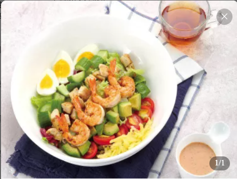 混合生菜、鸡蛋、车打芝士、香煎鸡胸肉、香煎大虾、牛油果、樱桃番茄、水果青瓜