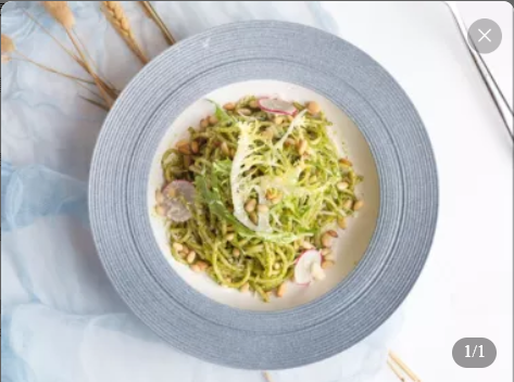 直意粉,洋葱丝,大蒜,橄榄油,罗勒酱,松子,芝麻菜,巴马臣芝士粉