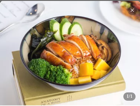 寿司饭、特调酱油,照烧鸡腿,西兰花,炒蘑菇,裙带菜,青瓜片,芒果
