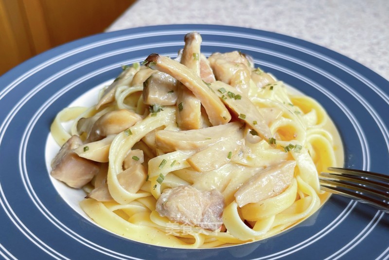 意大利宽面、鸡腿、鸡腿菇、蒜、酱油、鲜奶油、欧芹碎、黑椒盐