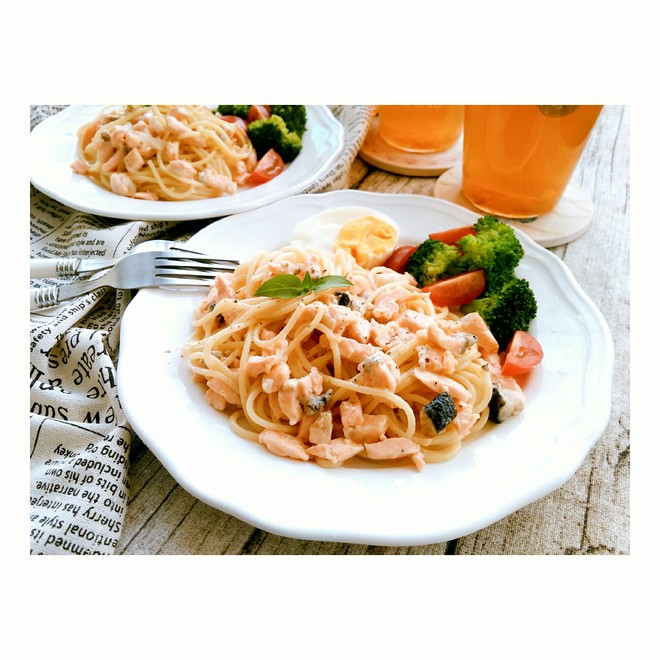 用料:罗勒叶、意大利面(市场上有卖现成的意大利面)、三文鱼、蘑菇、胡萝卜片、西葫芦条、大蒜瓣、盐、橄榄油、芝士粉、洋葱碎、水、苦生菜、罗勒酱