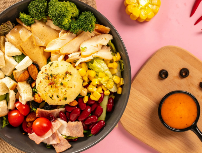碳水:土豆 面包片 膳食纤维:生菜、黄瓜、番茄 蛋白质:鸡蛋、鸡胸肉 配低卡油醋汁