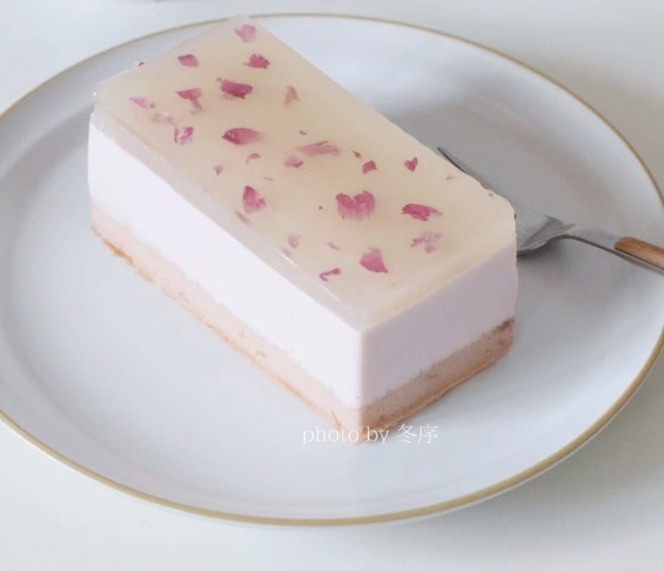 听我的!有荔枝味的蛋糕胚很加分!荔枝玫瑰蛋糕胚+玫瑰荔枝酸奶慕斯+荔枝果冻,清甜荔枝与玫瑰香气在口中索绕,每一口都是夏天的味道~
