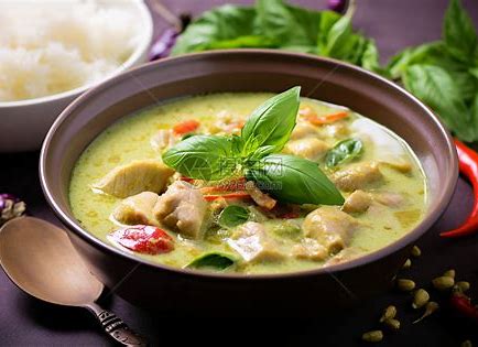 这是泰国菜的代表之一。主要食材是鸡肉和绿咖喱酱。绿咖喱酱由绿辣椒、香茅、柠檬叶、南姜等多种香料混合制成,味道浓郁辛辣。鸡肉切成小块,与绿咖喱酱一起炒制,还会加入椰奶、茄子、竹笋等食材。椰奶使菜肴的口感